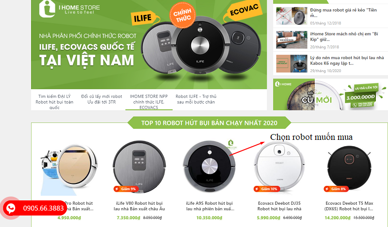 Bên cạnh đó, quý khách hàng còn có thể đặt mua robot hút bụi lau nhà online thông qua Hotline 0905.663.883, fanpage iHome Store – Điện Máy Thông Minh.