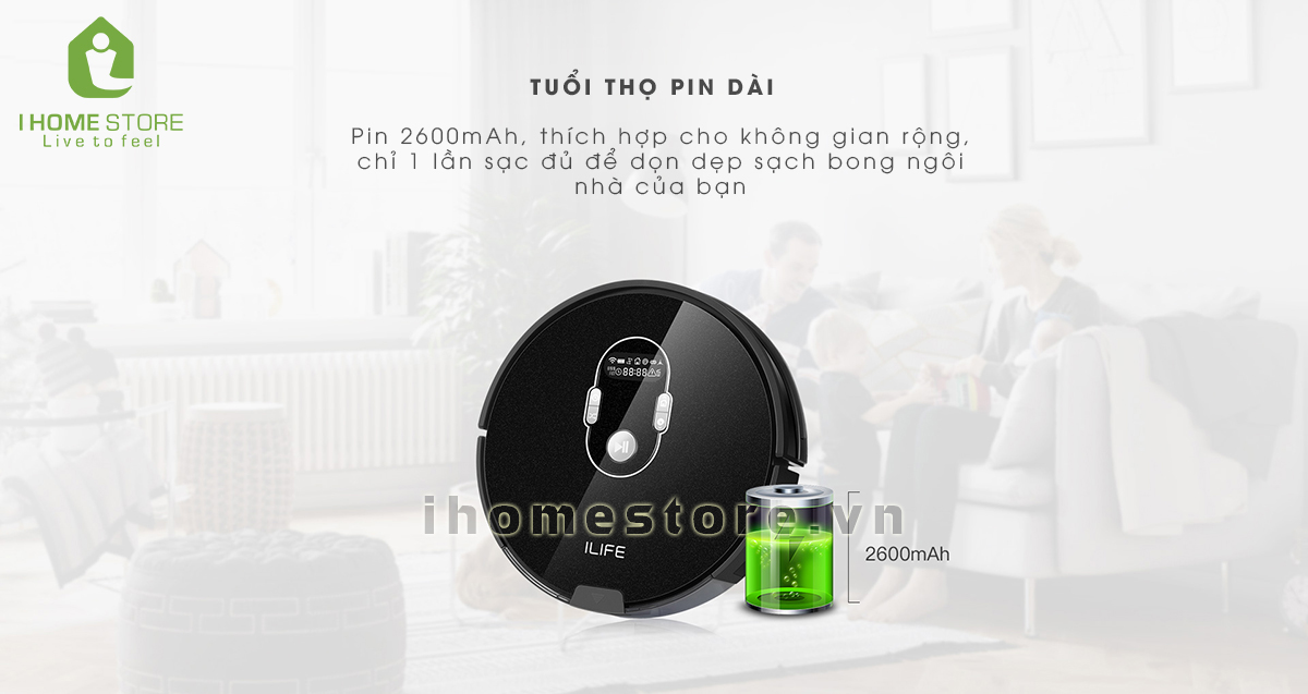 Hầu hết các robot ILIFE đều đi kèm với pin Li-Ion 2600mAh có thời lượng sử dụng lâu hơn các thiết bị đắt nhất trên thị trường. Các dòng Robot khác có thể làm việc từ 90 – 100 phút, trong khi các máy ILIFE có thời gian làm sạch ít nhất 120 phút trở lên. Robot có đủ khả năng để hút sạch bụi cho một hộ gia đình có diện tích 120-200 mét vuông trong 1 lần hoạt động.