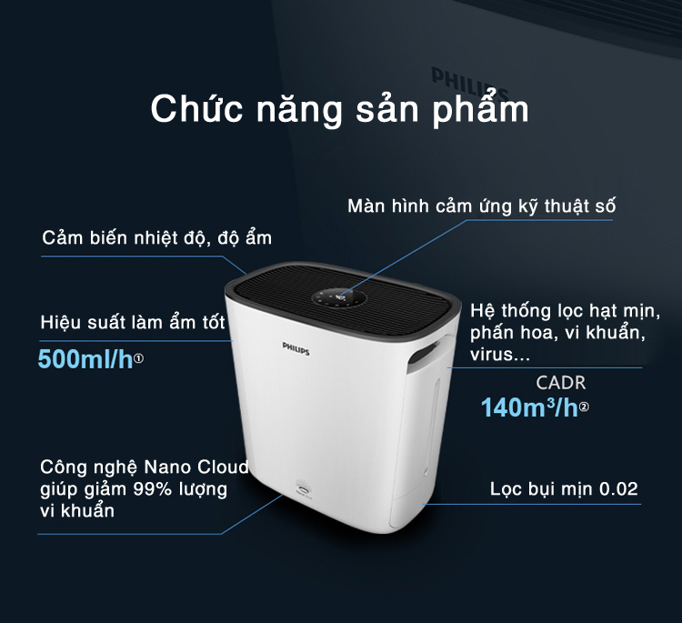 Công nghệ Philips NanoCloud cải thiện không khí trong nhà, văn phòng và các nội thất khác bằng cách duy trì độ ẩm không đổi và thậm chí tương đối trong khoảng từ 40% đến 60%. Với cài đặt độ ẩm 40%, 50%, 60% hoặc độ ẩm liên tục. Bạn có thể tự động kiểm soát độ ẩm trong nhà khi cần thiết. Độ ẩm tối ưu này làm giảm các vấn đề sức khỏe do không khí khô và làm cho hơi thở thoải mái hơn.