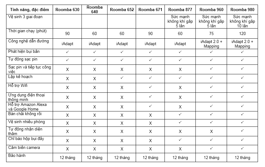 Tùy vào nhu cầu, ngân sách và không gian ngôi nhà của bạn mà bạn có thể chọn lựa những dòng Roomba khác nhau. Để tiện so sánh, hãy theo dõi bảng biểu dưới đây: