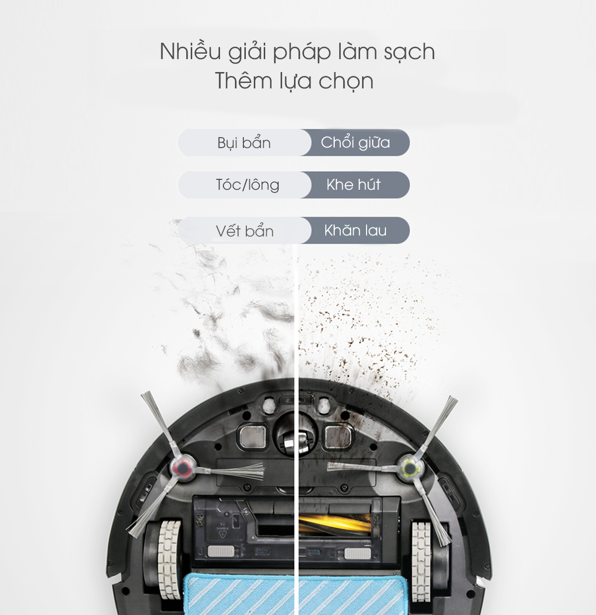 - Giai đoạn 2: Đôi chổi xoắn chữ V làm nhiệm vụ hút các mảnh vụn vào bên trong, ngay cả tóc hay lông thú cưng cũng sạch bong.