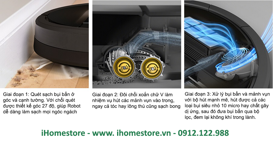 - Giai đoạn 3: Xử lý bụi bẩn và mảnh vụn với bộ hút siêu mạnh mẽ, hút được cả các loại bụi siêu nhỏ 10 micro hay chất gây dị ứng. Sau đó đưa bụi bẩn qua bộ lọc và đem lại không khí trong lành cho ngôi nhà của bạn.